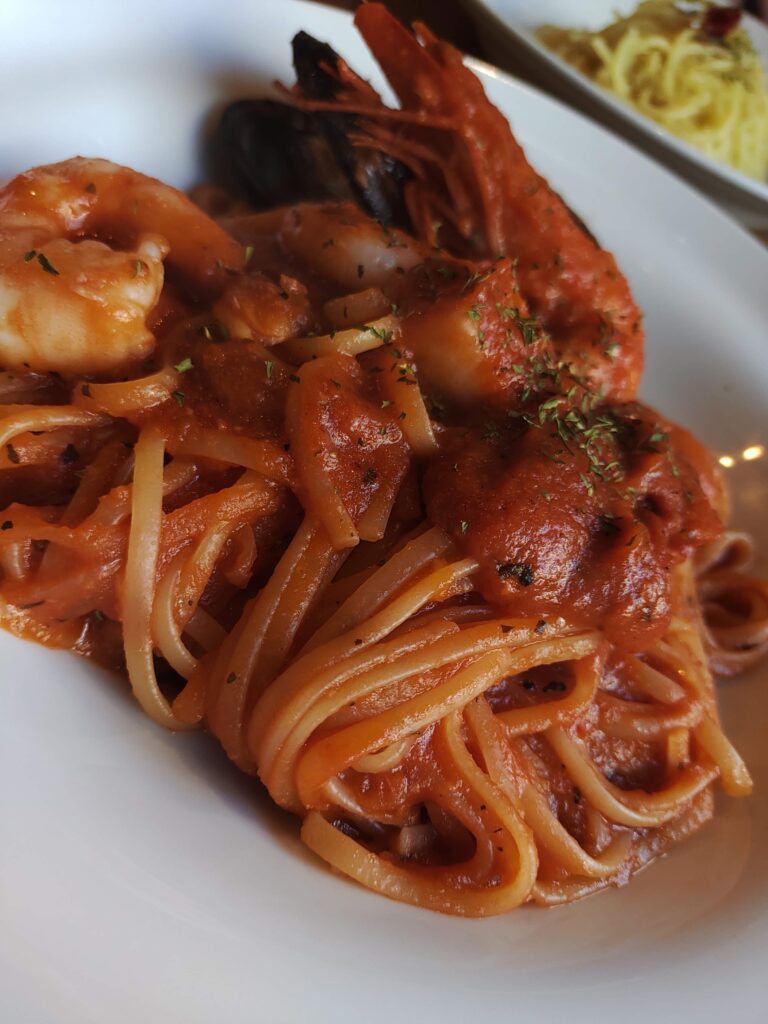 ・ペスカトーレ:今回のランチコースでいただいたのは、魚介の旨味が凝縮されたペスカトーレ。海老、ムール貝など、ごろっとした旬の魚介がたっぷりと使われています。トマトソースは、魚介のエキスが溶け込んだ奥深い味わい。余計な水分は飛ばした濃厚なソースがパスタにしっかりと絡みつき、一口食べるごとに海の香りが口いっぱいに広がります。絶品!!