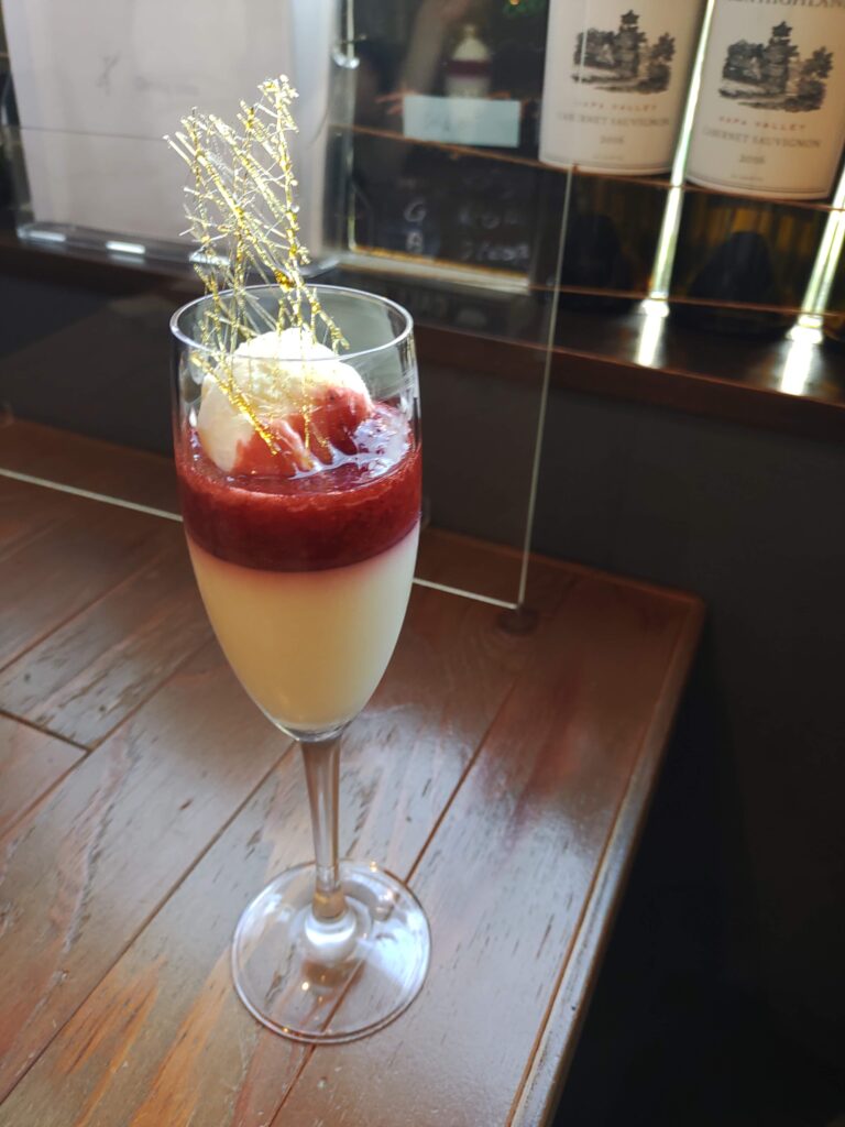 ・苺のパルフェ:食後のデザートは、見た目も華やかな苺のパルフェ(モモのひき的にはパフェでいいと思うけどブリスさんがパルフェっていくから仕方なく。。。パルフェいうのなんか恥ずい)。グラスの底には口溶けなめらかなパンナコッタ、その上には甘酸っぱい自家製の苺ソースが層になっています。トップには冷たいバニラアイスクリームと、繊細な飴細工が飾られており、まるで芸術品のようです。口に運ぶと、ひんやりとしたアイスとパンナコッタの優しい甘さ、苺ソースの爽やかな酸味が絶妙かつ美味。食後でもぺろりと食べられる、いや、むしろもう一杯いただきたいくらい美味しく、軽やかで上品なデザートでした。